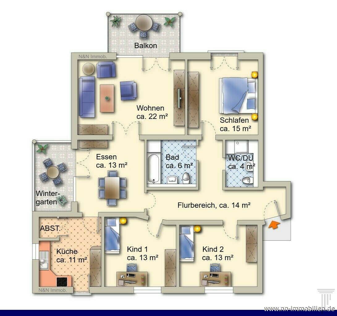 | Beschreibung | Diese großzügige 4-Zimmer-Wohnung mit ca. 116 m² Wohnfläche befindet sich im 1. Obergeschoss einer sehr gepflegten und überschaubaren Wohnanlage im beliebten Freiburger Stadtteil Rieselfeld. Ein Aufzug sorgt für einen komfortablen und barrierearmen Zugang zur Wohnung – ideal für Familien ebenso wie für ältere Bewohner, die großzügiges Wohnen mit einem separaten Arbeits- oder Gästebereich schätzen. Der durchdachte Grundriss bietet ein angenehmes Wohnambiente mit klar strukturierter Raumaufteilung und vielseitigen Nutzungsmöglichkeiten – ob für Paare mit größerem Platzbedarf, Familien mit älteren Kindern oder für ein großzügiges Homeoffice. Herzstück der Wohnung ist der helle Wohnbereich mit direktem Zugang zum westlich ausgerichteten Balkon, der besonders in den Nachmittags- und Abendstunden zum Verweilen einlädt. Ein separater Essbereich schließt sich an und verfügt über einen direkten Zugang zum Wintergarten, der als geschützter Aufenthaltsbereich – beispielsweise als Leseecke oder zusätzlicher Arbeitsbereich – genutzt werden kann. Die separate Küche ist räumlich vom Wohn- und Essbereich getrennt. Eine Einbauküche ist nicht vorhanden und muss vom zukünftigen Mieter selbst eingebracht werden – ideal für eine individuelle Gestaltung nach eigenen Vorstellungen. Insgesamt stehen drei weitere Zimmer zur Verfügung, die flexibel als Schlafzimmer, Kinderzimmer, Gästezimmer oder Homeoffice genutzt werden können. RAUMAUFTEILUNG UND AUSSTATTUNG - Wohnzimmer mit Zugang zum Westbalkon - Separater Essbereich mit Zugang zum Wintergarten - Drei weitere Zimmer (Schlaf-, Kinder-, Gäste- oder Arbeitszimmer) - Separate Küche (ohne Einbauküche) - Zwei Bäder: • Bad mit Badewanne, Waschbecken und WC • Duschbad mit Waschbecken und WC - Flurbereich mit praktischen Abstellflächen - Aufzug im Haus Zur Wohnung gehören ein separater Kellerraum sowie ein Stellplatz in der Tiefgarage. Darüber hinaus stehen gemeinschaftlich nutzbare Räume wie ein Wasch-/Trockenraum, ein Müllplatz sowie Fahrradabstellmöglichkeiten zur Verfügung. Die Wohnanlage präsentiert sich in einem gepflegten Gesamtzustand. HINWEISE: Die Wohnung eignet sich aufgrund ihrer Größe und Raumaufteilung besonders für einen Zwei- bis Vier-Personen-Haushalt oder für Personen mit zusätzlichem Platzbedarf (z. B. für ein Homeoffice). Die Wohnung wird als Nichtraucherwohnung vermietet. Eine Nutzung als Wohngemeinschaft ist nicht vorgesehen. Wir freuen uns auf Anfragen von zuverlässigen Mietinteressenten mit gesichertem Einkommen, die an einem langfristigen Mietverhältnis interessiert sind. Weitere interessante Miet- und Kaufangebote finden Sie unter: www.nn-immobilien.de |
