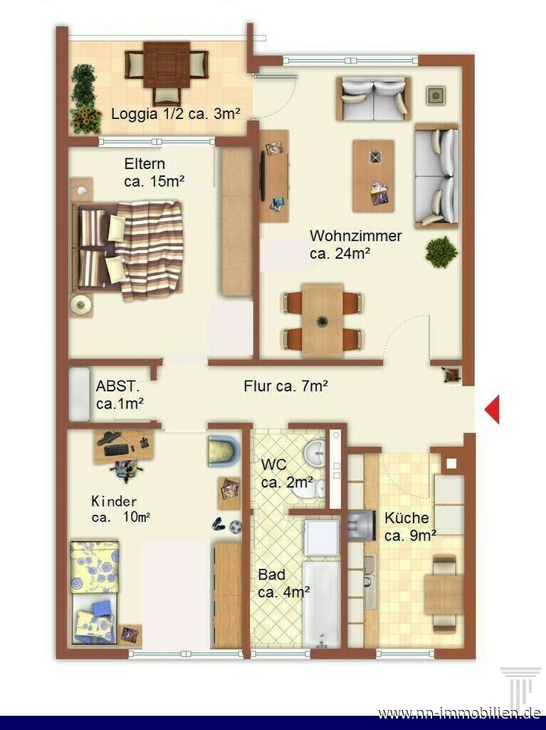 | Beschreibung | Diese gepflegte 3-Zimmer-Wohnung befindet sich im Hochparterre eines Mehrfamilienhauses ohne Aufzug und überzeugt durch ihre ruhige Wohnlage im Grünen sowie durch einen funktionalen, gut durchdachten Grundriss. Das großzügige Wohnzimmer bietet viel Platz für eine gemütliche Wohnlandschaft und verfügt über den direkten Zugang zur verglasten Loggia. Von hier aus genießen Sie einen erholsamen Blick in die gepflegte Gartenanlage. Die Wohnung umfasst zudem ein helles Schlafzimmer sowie ein weiteres Zimmer, das sich ideal als Kinderzimmer oder Homeoffice eignet. Ein praktischer Abstellraum innerhalb der Wohnung sorgt zusätzlich für wertvollen Stauraum. Das Tageslichtbad ist mit einer Badewanne ausgestattet. Das separate WC verfügt über einen Waschmaschinenanschluss und bietet somit einen weiteren funktionalen Vorteil. Die separate Küche ist mit einer funktionalen Einbauküche ausgestattet, die dem Mieter kostenfrei zur Nutzung überlassen wird. AUSSTATTUNG: • Helles, gut geschnittenes Wohnzimmer mit Zugang zur verglasten Loggia / Balkon • Laminat- und Fliesenböden in der gesamten Wohnung • Separate Küche inkl. Einbauküche (kostenfrei zur Verfügung gestellt) • Tageslichtbad mit Badewanne • Separates WC mit Waschmaschinenanschluss • Großes Schlafzimmer + weiteres Zimmer (Kinderzimmer/Homeoffice) • Abstellraum in der Wohnung • Loggia mit Blick ins Grüne • Eigenes Kellerabteil, Fahrradkeller & Trockenraum • Separater PKW-Stellplatz • Gepflegte Gemeinschaftsanlage mit altem Baumbestand • Ruhige, naturnahe Wohnlage Kurzum: Die Wohnung eignet sich ideal für Paare oder kleine Familien, die eine ruhige, naturnahe Lage schätzen und dennoch eine gute Anbindung zur Freiburger Innenstadt wünschen. Der Vermieter bevorzugt berufstätige Paare oder Paare mit einem Kind – keine Wohngemeinschaft. Haustiere sind nicht erwünscht. Weitere interessante Miet- und Kaufangebote unter, www.nn-immobilien.de |