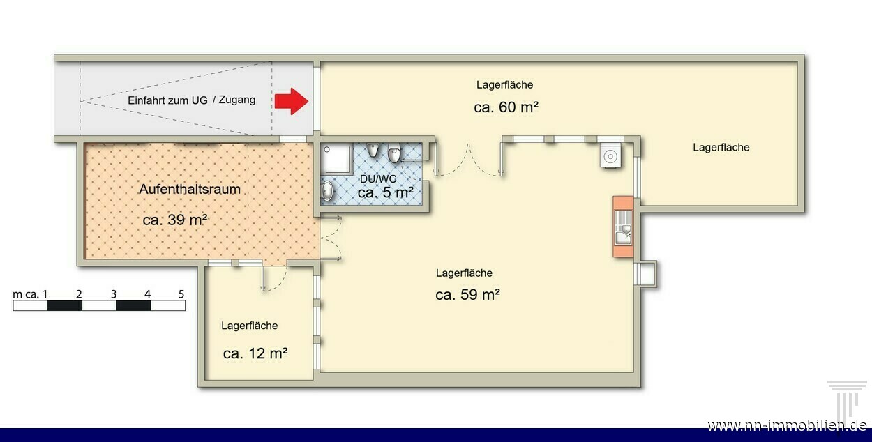 | Beschreibung | Diese gepflegte Gewerbeeinheit im Untergeschoss bietet insgesamt ca. 175 m² Nutzfläche und überzeugt durch eine vielseitige Raumaufteilung mit Aufenthalts-/Büroraum, mehreren Lager- bzw. Werkstattbereichen sowie einem Duschbad mit WC. Perfekt für Unternehmen, die Büro- und Lagerbedarfe kombinieren möchten, oder für Dienstleister, Handwerksbetriebe und Archivnutzungen. Der separate Zugang über die Außenzufahrt ermöglicht einen eigenständigen Betriebsablauf – ideal für Materialanlieferungen oder diskrete Zugänge. Die Räume sind hell, gepflegt und funktional gestaltet. Ein Starkstromanschluss sowie ein neues, elektrisch betriebenes Garagentor erweitern die Nutzungsmöglichkeiten und erleichtern insbesondere handwerklichen oder lagerintensiven Betrieben die tägliche Arbeit. AUSSTATTUNG UND RAUMAUFTEILUNG • Heller Aufenthalts- / Büroraum mit Fenster und guter Stellfläche • Mehrere Lagerflächen unterschiedlicher Größe (ideal für Waren, Werkzeuge, Archiv) • Duschbad mit WC • Starkstromanschluss vorhanden • Neues elektrisches Garagentor für komfortables Be- und Entladen (Zufahrt mit Gefälle – nicht für Groß-LKW geeignet) • Separater Eingang über eine eigene Außenzufahrt • Robuste Boden- und Wandbeläge, pflegeleicht und langlebig • Gute Belichtung in den Arbeitsbereichen • Solide Gebäudestruktur • Praktischer Grundriss für unterschiedlichste Nutzungen GEEIGNETE NUTZUNG • Büronutzungen kleiner und mittelständischer Betriebe • Handwerks- und Dienstleistungsbetriebe mit zusätzlichem Lagerbedarf • Archivräume für Unternehmen oder Organisationen • Kleinlager oder Archivflächen • Kleiner Hobby- und Werkstattbereiche (nicht öffentlich zugänglich) Die Räume lassen sich flexibel gestalten – ideal für Unternehmen, die eine wirtschaftliche, gut erreichbare und vielseitige Gewerbefläche suchen. BESONDERHEITEN: • Die angegebenen Mietpreise verstehen sich als Nettomietpreise, jeweils zuzüglich Betriebs- und Nebenkosten. • Es werden Mietverträge mit einer Laufzeit von 3 bis 5 Jahren angestrebt. Die tatsächliche Vertragslaufzeit ist verhandelbar. • Die Maklerprovision ist mit Zustandekommen des Mietvertrages verdient und fällig. • Energieausweis: Derzeit nicht vorhanden (in Vorbereitung). Haben wir Ihr Interesse geweckt? Kontaktieren Sie uns gerne über das Immobilienportal und teilen Sie uns Ihre geplante Nutzung mit. Wir freuen uns auf Ihre Anfrage! Weitere attraktive Miet- und Kaufangebote finden Sie auf unserer Website: www.nn-immobilien.de |