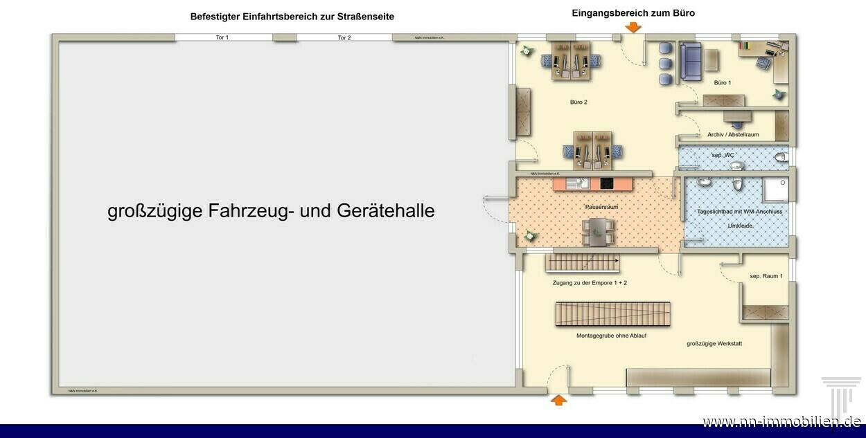 | Beschreibung | Diese großzügige und vielseitig nutzbare Gewerbehalle in Schliengen überzeugt durch ihre klare Struktur, sehr gute Belichtung und eine funktionale Aufteilung auf mehrere Ebenen. Die Immobilie eignet sich ideal für Produktion, Lager, Logistik, Handwerk, Montage, Showroom oder kombiniertes Arbeiten mit Büro und Lager. Die Halle präsentiert sich dank der hohen Firsthöhe, der großflächigen Dachlichtbänder und der professionell aufbereiteten Innenaufnahmen hell, offen und repräsentativ – optimale Voraussetzungen für effiziente Arbeitsabläufe. ECKDATEN: - Gesamtfläche Halle inkl. Büro: ca. 480 m² - Bürofläche unter der Ebene: ca. 90 m² - Fahrzeug-/Gerätehalle und Werkstatt: ca. 390 m² - Firsthöhe Halle: ca. 8,90 m - Einfahrtstor: Höhe ca. 4,90 m / Breite ca. 4,50 m AUFTEILUNG UND AUSSTATTUNG - Großzügige, stützenarme Hallenfläche - Sehr gute natürliche Belichtung durch Dachflächenfenster - Hohe Decken – ideal für Regalsysteme, Maschinen oder Hochlager - Betonboden, belastbar und pflegeleicht - Zwei direkte Zugänge zur Halle - Großes Sektionaltor für LKW-, Transporter- und Staplerverkehr EMPOREN / ZUSÄTZLICHE EBENEN - zwei zusätzliche Ebenen, mit eigenem Treppenaufgang - Ideal nutzbar als Lager, Technikfläche oder Zusatzarbeitsbereiche - Belastbarkeit Empore: ca. 300 kg/m² BÜROEINHEIT (ca. 90 m², unter der Ebene) - heller, großzügiger Büroraum - Separate Nutzung möglich - Ruhige Arbeitsatmosphäre, klar vom Hallenbetrieb getrennt - Tageslichtbad mit Dusche / Umkleide - Separates WC - Aufenthaltsraum mit möglichen Küchenanschluss - Separater Außeneingang für Kunden, Mitarbeiter oder Verwaltung HIGHLIGHTS - Sehr gute Kombination aus Halle, Büro und Nebenflächen - Hohe Flexibilität für unterschiedlichste Gewerbenutzungen - Mehrere Ebenen mit klarer Trennung der Nutzungsbereiche - Gute Andienung und großzügige Rangiermöglichkeiten NUTZUNGSMÖGLICHKEITEN - Produktion & Montage - Lager & Logistik - Handwerksbetrieb - Technischer Betrieb - Showroom mit Lager - Kombination aus Büro & Gewerbe MIETKONDITIONEN UND WEITERE INFORMATIONEN Es werden Mietverträge mit einer Laufzeit von 3 bis 5 Jahren angestrebt. Die genaue Vertragslaufzeit ist verhandelbar. Bei den angegebenen Mietpreisen handelt es sich um Nettomietpreise zzgl. umlagefähiger Betriebs- und Nebenkosten sowie der gesetzlichen Umsatzsteuer in jeweils geltender Höhe. Die Maklerprovision entsteht gemäß § 652 BGB mit Abschluss eines wirksamen Mietvertrages und ist zu diesem Zeitpunkt verdient und fällig. Ein Provisionsanspruch besteht auch bei wirtschaftlich gleichwertigem Vertragsabschluss. Ein Energieausweis ist in Vorbereitung. Die Abbildungen - einschließlich der dargestellten Möblierung - können digital bearbeitet oder KI-gestützt visualisiert sein und dienen ausschließlich der Veranschaulichung. Kurzum: Diese Gewerbehalle bietet Raum, Höhe, Struktur und Flexibilität – ideal für Unternehmen, die eine funktionale und zugleich repräsentative Gewerbefläche suchen. Die Kombination aus großzügiger Halle, separatem Büro, mehreren Ebenen und guter Belichtung macht dieses Objekt zu einer attraktiven und vielseitigen Gewerbeimmobilie. Neugierig geworden? Wir freuen uns auf Ihre aussagekräftige Kontaktaufnahme unter Angabe Ihres geplanten Nutzungskonzepts - gerne per E-Mail. Weitere interessante Miet- und Kaufangebote finden Sie unter: www.nn-immobilien.de |