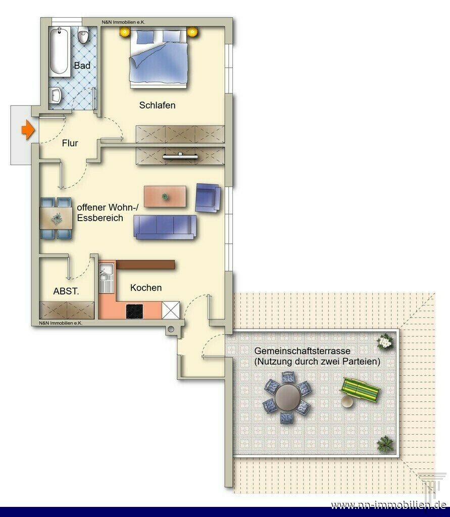 | Beschreibung | Diese gepflegte 2-Zimmer-Wohnung mit ca. 55 m² Wohnfläche befindet sich im 1. Obergeschoss eines Mehrfamilienhauses (Baujahr 1995) ohne Aufzug. Die Wohnung überzeugt durch eine praktische Raumaufteilung sowie helle und freundliche Räume. Der großzügige Wohn- und Essbereich mit offener Küche bietet vielfältige Gestaltungsmöglichkeiten. Die vorhandene Einbauküche ist im Mietpreis enthalten. Das Schlafzimmer ist gut geschnitten und bietet ausreichend Stellfläche. Das Tageslichtbad ist mit einer Badewanne ausgestattet. AUSSTATTUNG - Einbauküche inklusive - Heller Wohn- und Essbereich - Tageslichtbad mit Badewanne - Fliesen- und Laminatboden - Gemeinschaftsterrasse zur Mitbenutzung (Nutzung durch zwei Parteien) Zur Wohnung gehört ein Außenstellplatz. Darüber hinaus stehen ein offener Gemeinschaftsspeicher sowie ein Wasch- und Trockenraum mit separatem Waschmaschinenanschluss zur gemeinschaftlichen Nutzung zur Verfügung. Die Wohnung eignet sich ideal für eine Einzelperson oder ein Paar. Bevorzugt wird die Vermietung an berufstätige Mieter mit gesichertem Einkommen. Haustierhaltung ist nach Rücksprache mit dem Vermieter möglich. „kein Energieausweis vorhanden" (in Vorbereitung) Weitere interessante Miet-& Kaufangebote unter, www.nn-immobilien.de |